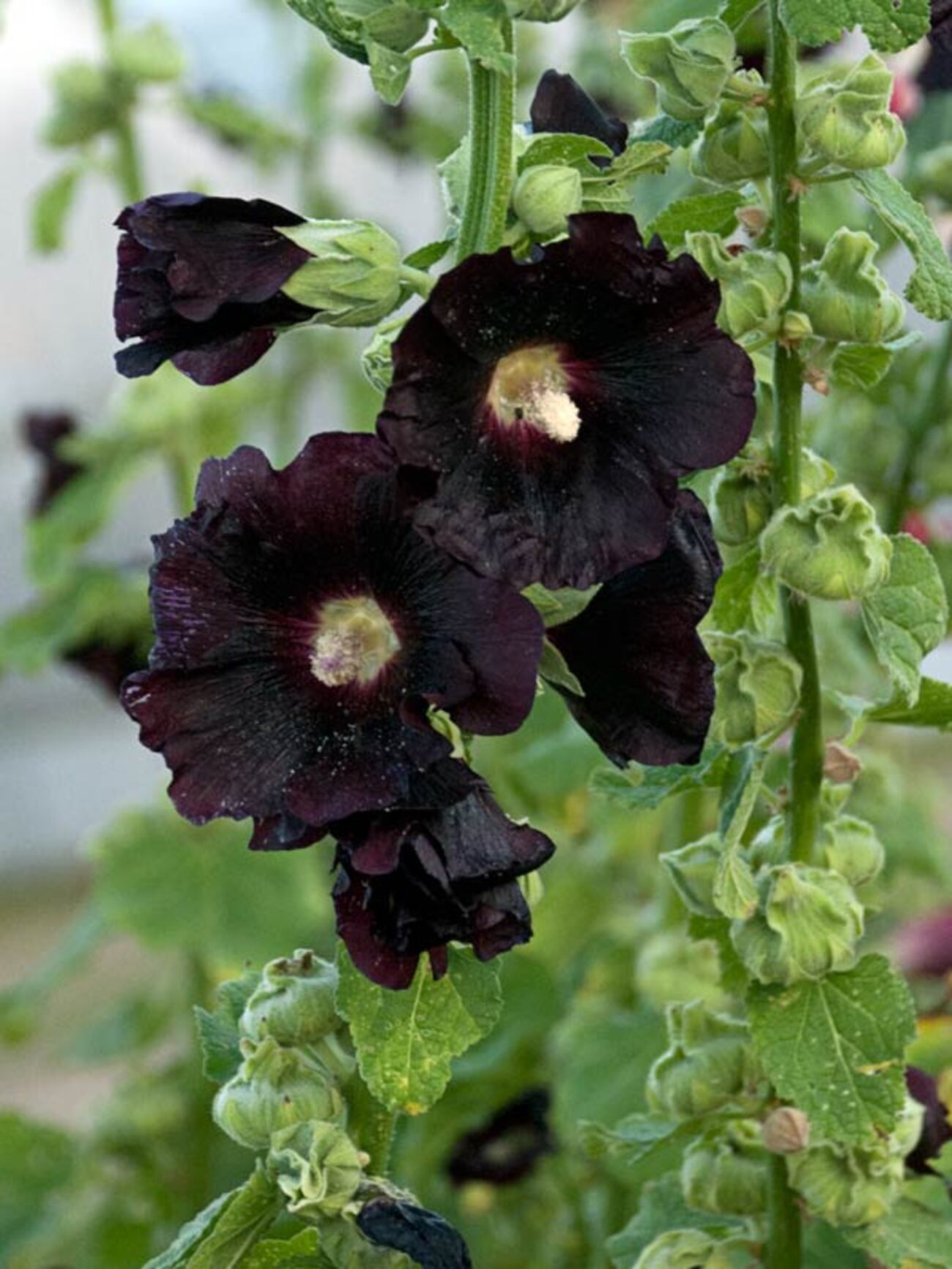 - Hollyhock Blacknight — Numerous single-style blooms cover each tall flower spike towering over strong bushy foliage. The color is deepest black/purple. Source: Bluestone Perennials